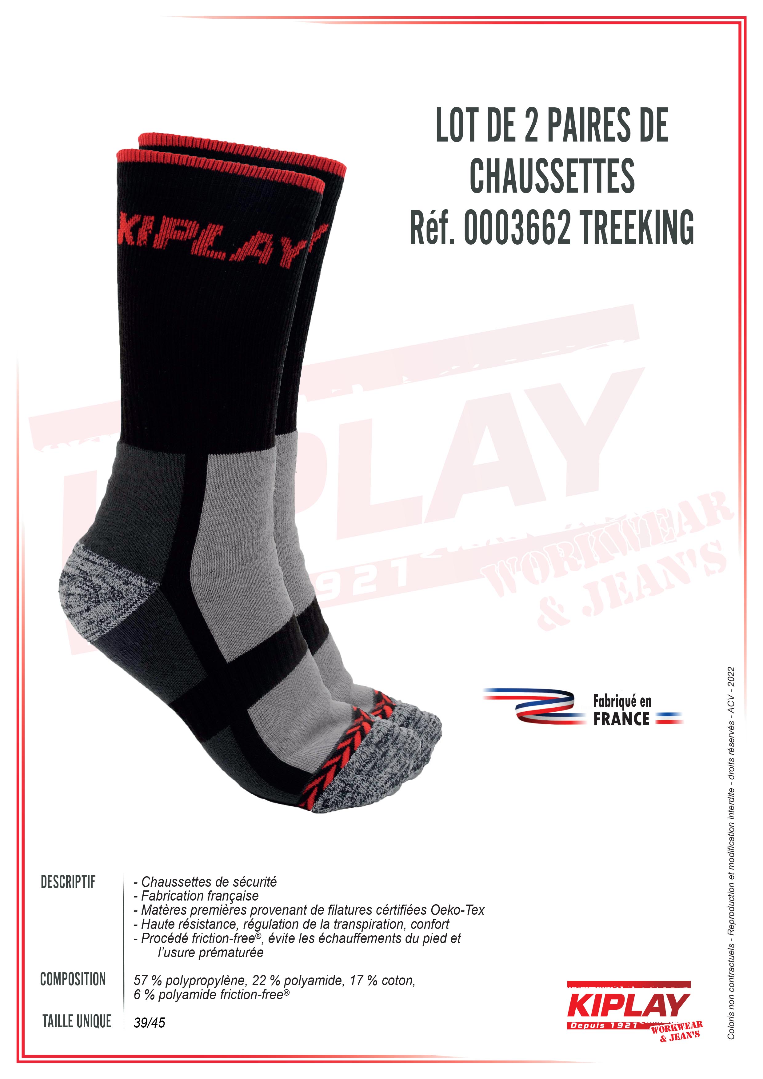 Chaussettes de sécurité. Fabrication française. Matières premières provenant de filatures certifiées Oeko-Tex. Haute résistance, régulation de la transpiration, confort. Procédé Friction Free® évite les échauffements du pied et l'usure prématurée.