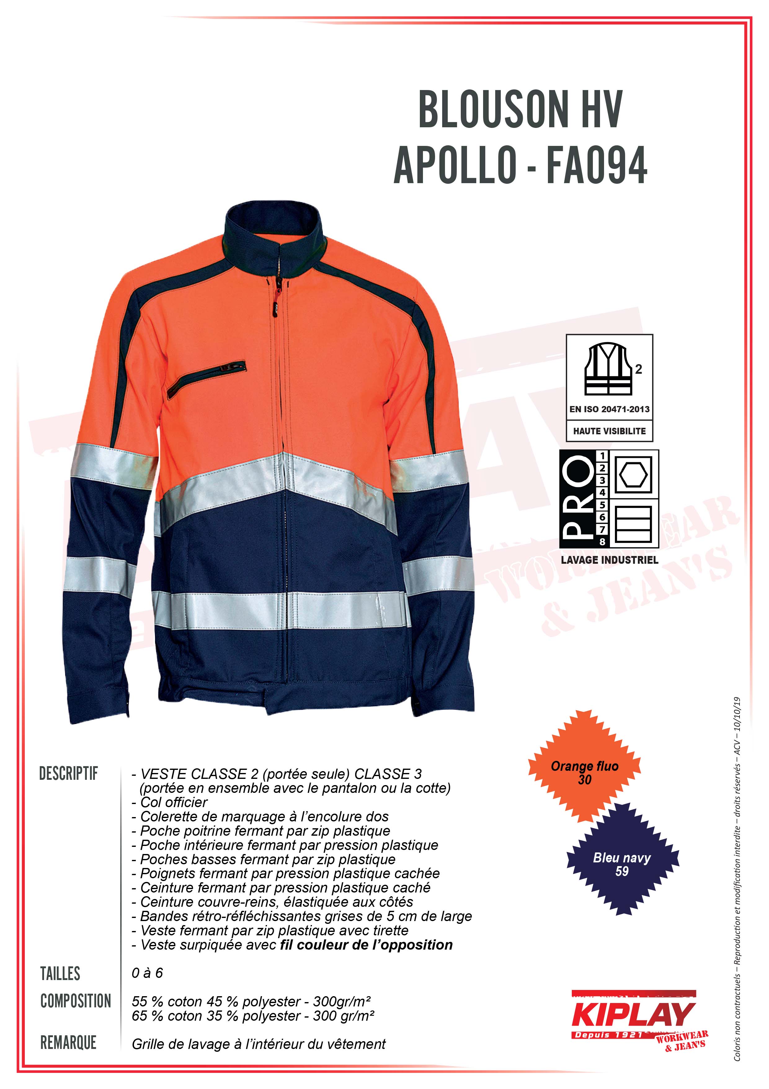 Grille de lavage à l’intérieur du vêtement. Blouson de travail looké avec couvre-reins, fermeture et poches cotées par zip. Tissu français, bandes rétroréfléchissantes 3M et mercerie tout plastique.