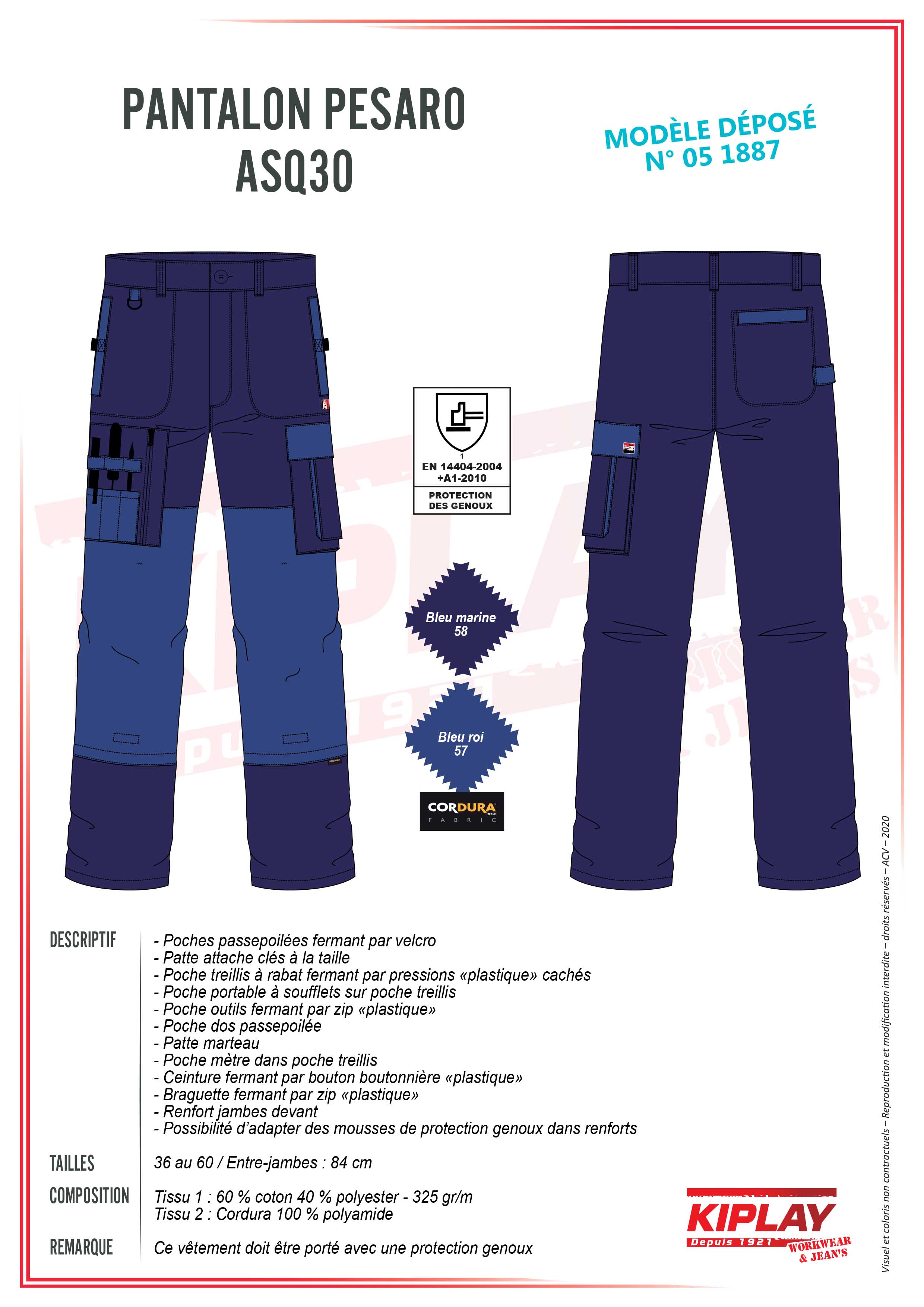 Poche treillis avec poche-mètre intégrée, poche téléphone, 2 poches passepoilées côtés fermées par velcro, braguette zip, 1 poche plaquée à droite, 1 poche arrière passepoilée, accroche clef, poche compartiment outils, patte marteau. Cordura imperméable.
